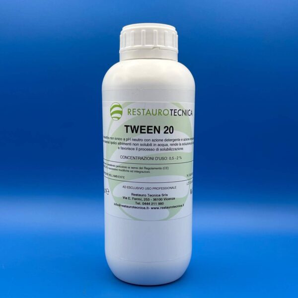 Il Tween 20 è indicato per operazioni di pulitura superficiale di strati policromi e per la preparazione dell’emulsione grassa. Con l’acqua ha elevate proprietà emulsionanti, detergenti, e solubilizzanti anche a basse concentrazioni di prodotto (0,5 – 2%).